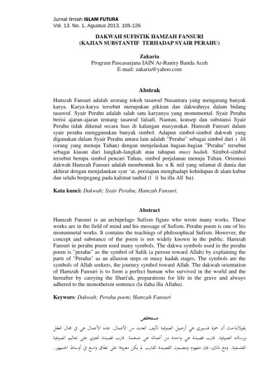 Bahasa menampung bahasa konotatif serta kiasan, dalam hal ini perlu dipahami serius bila ingin memperoleh arti yang terbesit. Karya rubba al muhakkikina, syair perahu, dan syair dagang. Penelitian ini bertujuan untuk mengetahui bagaimana karakteristik sastra sufi yang terdapat dalam syair perahu karangan hamzah fansuri. Kajian semantik (ships and boats in the story of king banjar: makna yang pertama adalah jelas, tetapi makna yang kedua memerlukan mata hati, atau pemikiran dan keintelektualan untuk memahaminya. Setiap baris terdiri atas 8 sampai 14 suku kata. Informasi awal tentang kapal dalam hikayat raja banjar terdapat dalam tulisan lapian (1996: Keluasan dan keluwesan pilihan katanya sangat menarik hati untuk dibaca dan dibaca lagi. syair agama tergolong syair terpenting, terbagi menjadi 4, yakni syair sufi, syair mengenai ajaran islam, syair riwayat nabi, serta syair nasihat. Perhatikan contoh syair berikut ! 87) mengatakan bahwa naskah melayu klasik juga menggunakan metafor perahu seperti syair perahu karya hamzah fansuri. Jagalah hati agar senantiasa damai. Baiklah perahu engkau perteguh, hasilkan pendapat dengan tali sauh, anginnya keras ombaknya cabuh, pulaunya jauh tempat berlabuh.